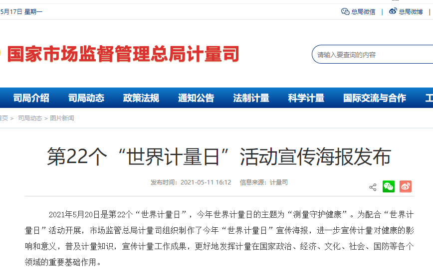 2021年5月20日是第22個“世界計量日”,今年世界計量日的主題為“測量守護健康”。為配合“世界計量日”活動開展,市場監管總局計量司組織制作了今年“世界計量日”宣傳海報,進一步宣傳計量對健康的影響和意義,普及計量知識,宣傳計量工作成果,更好地發揮計量在國家政治、經濟、文化、社會、國防等各個領域的重要基礎作用。