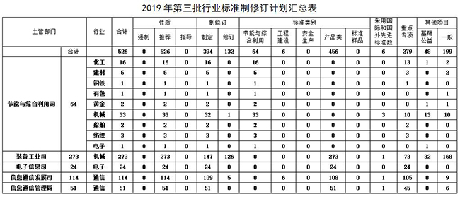 2019年第三批標(biāo)準(zhǔn)修制訂計(jì)劃共安排項(xiàng)目計(jì)劃526項(xiàng),其中制定394項(xiàng)、修訂132項(xiàng);重點(diǎn)專項(xiàng)標(biāo)準(zhǔn)279項(xiàng)、基礎(chǔ)公益類標(biāo)準(zhǔn)48項(xiàng)、一般標(biāo)準(zhǔn)199項(xiàng);產(chǎn)品類標(biāo)準(zhǔn)456項(xiàng)、工程建設(shè)標(biāo)準(zhǔn)6項(xiàng)、節(jié)能與綜合利用標(biāo)準(zhǔn)64項(xiàng)。這526項(xiàng)標(biāo)準(zhǔn)皆為推薦性質(zhì),涉及了化工、建材、鋼鐵、有色、黃金、機(jī)械、船舶、紡織、電子、通信等行業(yè)。無疑,這批標(biāo)準(zhǔn)的修制訂將是對(duì)標(biāo)準(zhǔn)化體系的進(jìn)一步完善,能有效促進(jìn)我國標(biāo)準(zhǔn)化水平的提升,同時(shí)也將推動(dòng)行業(yè)的高質(zhì)量發(fā)展和創(chuàng)新發(fā)展。