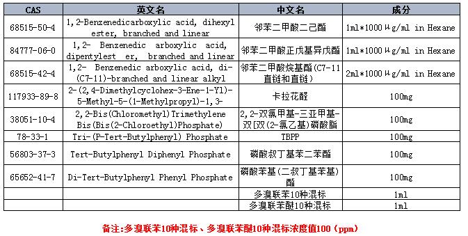 好消息!獨(dú)家經(jīng)營(yíng)產(chǎn)品鄰苯二甲酸類、磷酸類、多溴聯(lián)苯混標(biāo)類等標(biāo)準(zhǔn)物質(zhì)入庫啦,歡迎選購,價(jià)格優(yōu)惠,全部現(xiàn)貨供應(yīng),可當(dāng)天發(fā)貨。