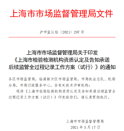 上海市檢驗檢測機(jī)構(gòu)資質(zhì)認(rèn)定及告知承諾后續(xù)監(jiān)管全過程記錄工作方案(試行)