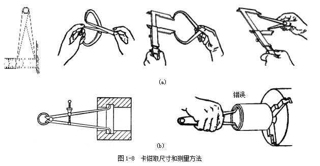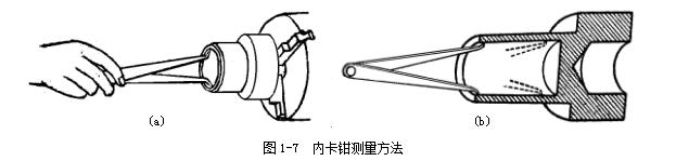 用巳在鋼直尺上或在外卡鉗上取好尺寸的內(nèi)卡鉗去測量內(nèi)徑,圖1-8a 所示。就是比較內(nèi)卡鉗在零件孔內(nèi)的松緊程度。如內(nèi)卡鉗在孔內(nèi)有較大的自由擺動時,就表示卡鉗尺寸比孔徑內(nèi)小了;如內(nèi)卡鉗放不進(jìn),或放進(jìn)孔內(nèi)后緊得不能自由擺動,就表示內(nèi)卡鉗尺寸比孔徑大了,如內(nèi)卡鉗放入孔內(nèi),按照上述的測量方法能有1~2mm的自由擺動距離,這時孔徑與內(nèi)卡鉗尺寸正好相等。測量時不要用手抓住卡鉗測量,圖1-8b 所示,這樣手感就沒有了,難以比較內(nèi)卡鉗在零件孔內(nèi)的松緊程度,并使卡鉗變形而產(chǎn)生測量誤差。